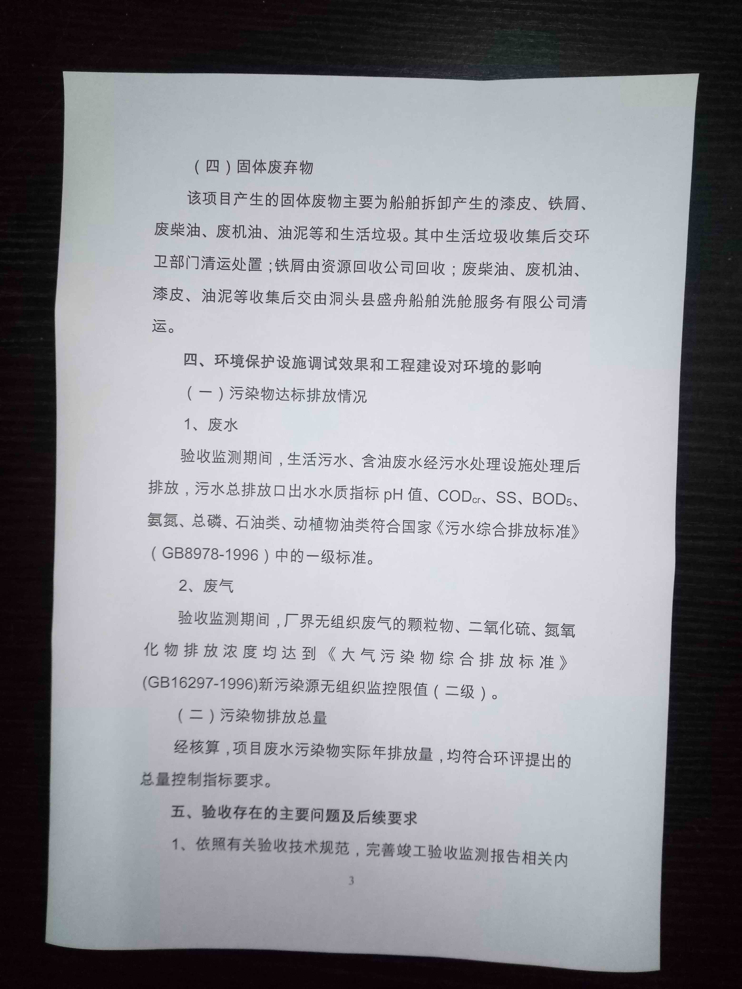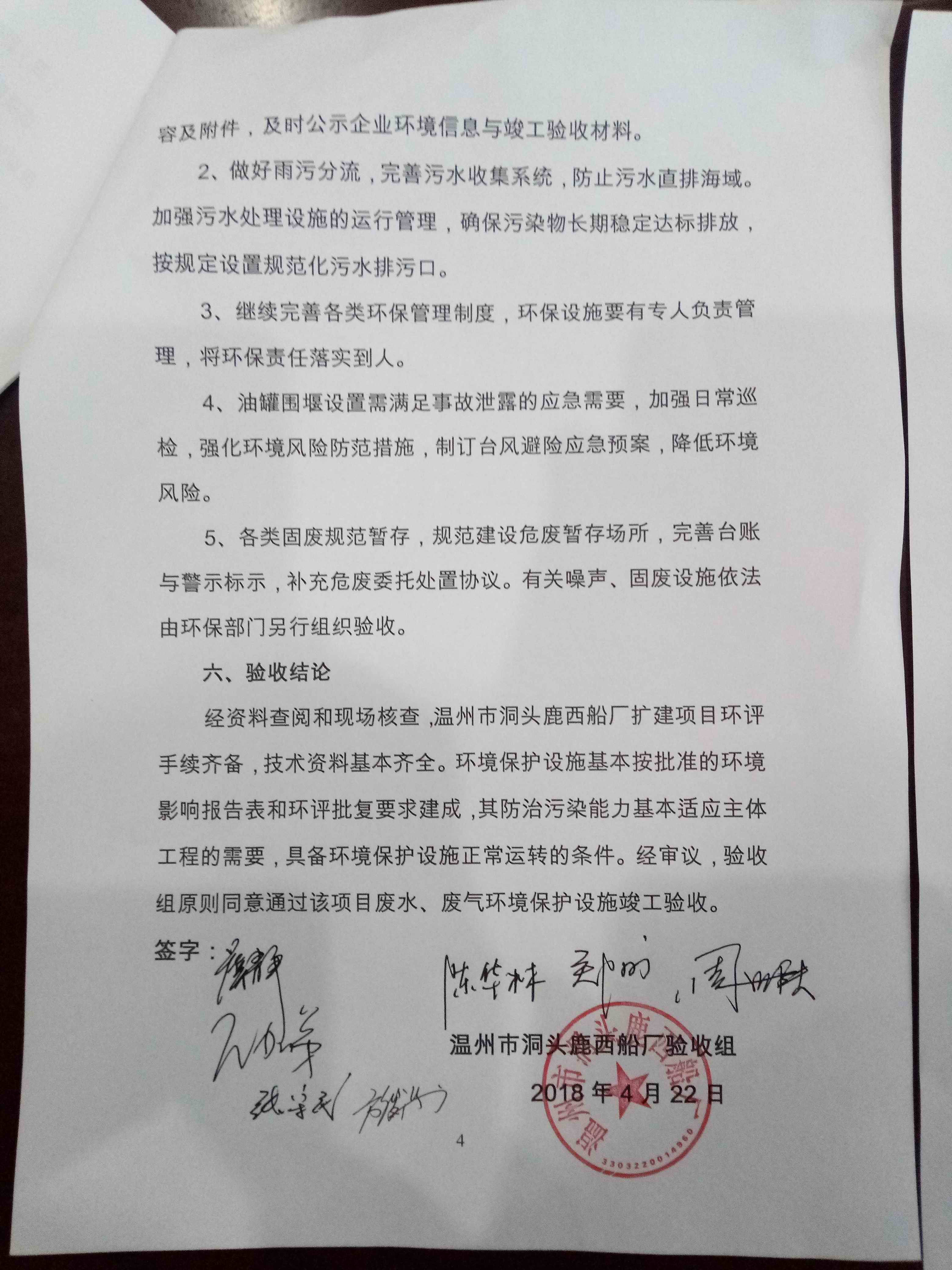 經(jīng)資料查閱和現(xiàn)場(chǎng)核查,溫州市洞頭鹿西船廠擴(kuò)建項(xiàng)目環(huán)評(píng)手續(xù)齊備,技術(shù)資料基本齊全。環(huán)境保護(hù)設(shè)施基本按批準(zhǔn)的環(huán)境影響報(bào)告表和環(huán)評(píng)批復(fù)要求建成,其防治污染能力基本適應(yīng)主體工程的需要,具備環(huán)境保護(hù)設(shè)施正常運(yùn)轉(zhuǎn)的條件。經(jīng)審議,驗(yàn)收組原則同意通過(guò)該項(xiàng)目廢水、廢氣環(huán)境保護(hù)設(shè)施竣工驗(yàn)收。