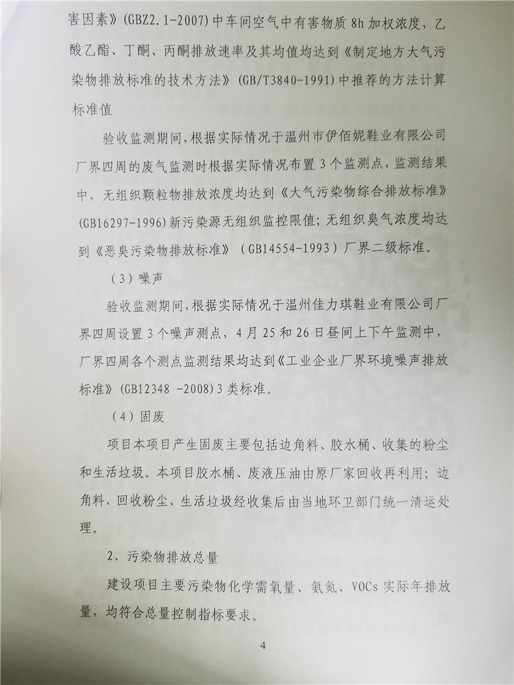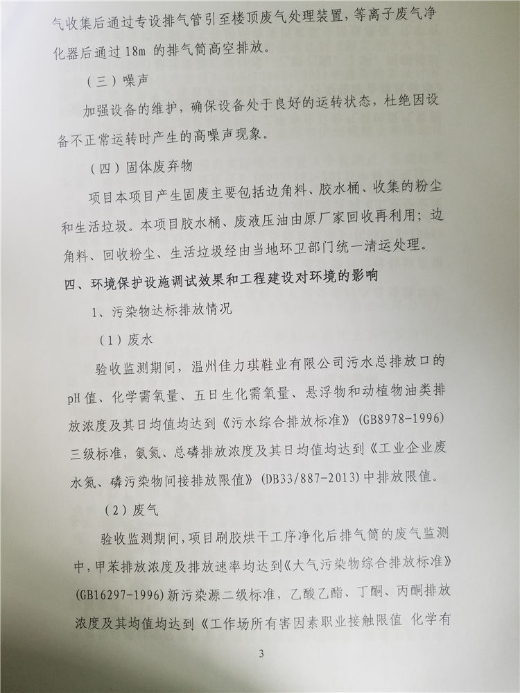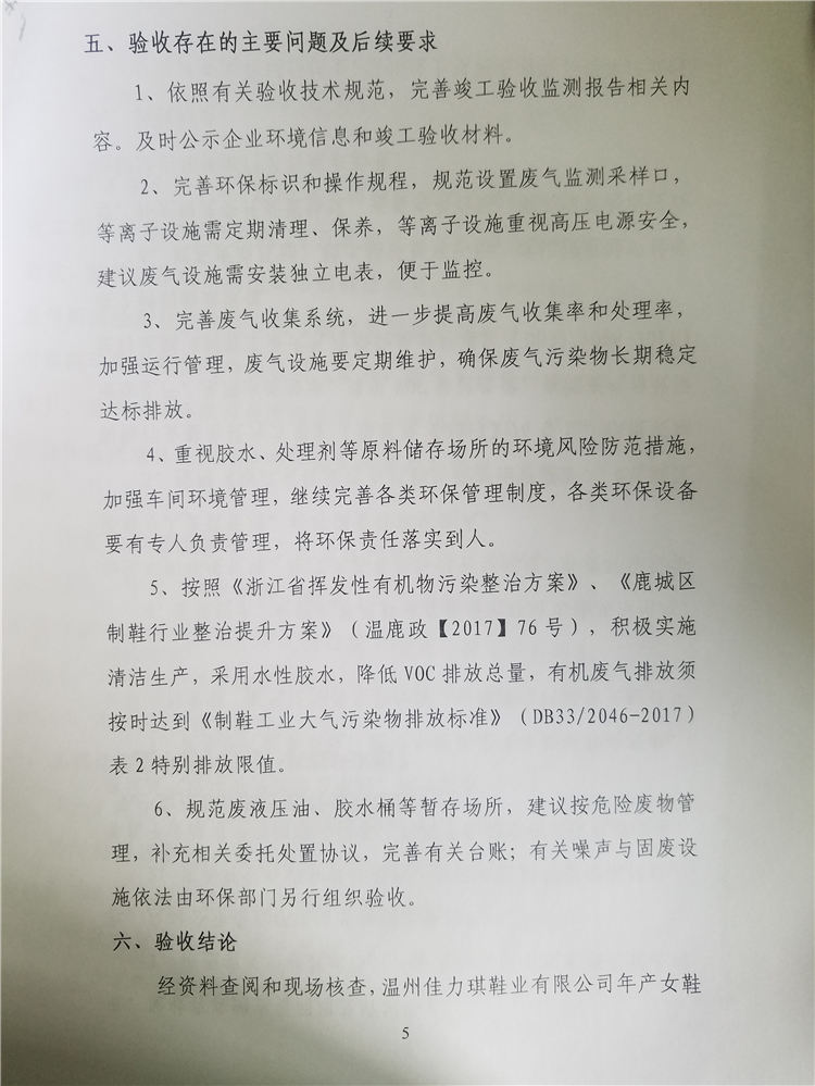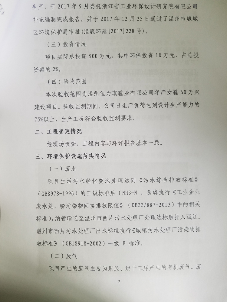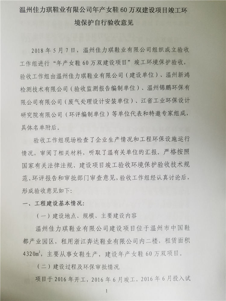 溫州佳力琪鞋業(yè)有限公司年產(chǎn)女鞋60萬雙建設(shè)項目竣工環(huán)境保護自行驗收— —公示