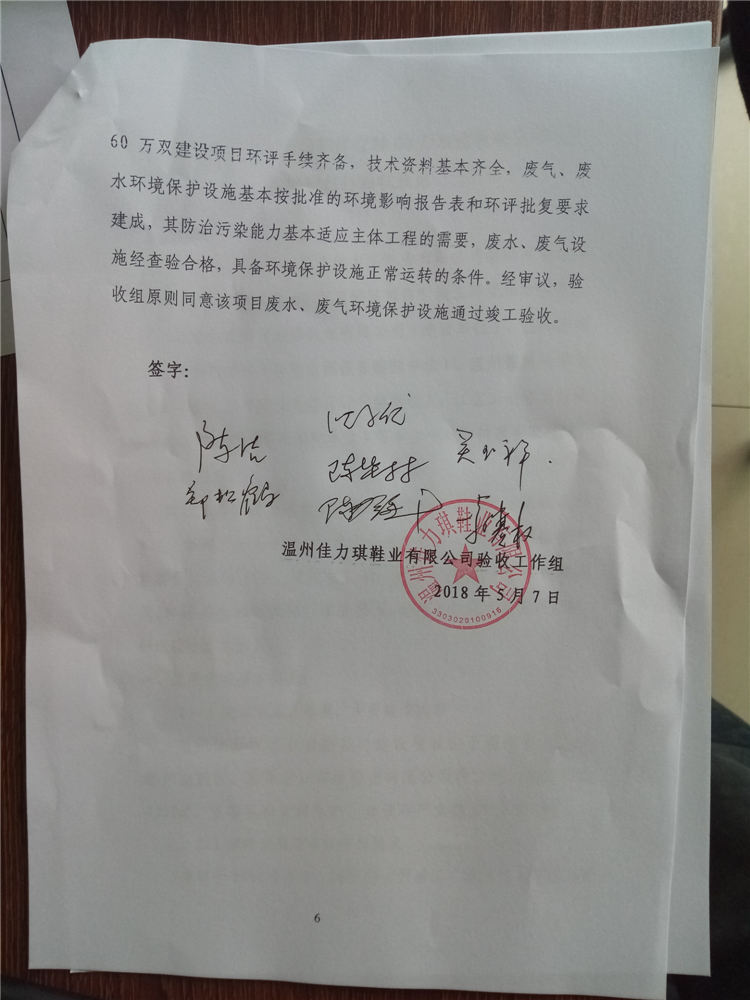 經(jīng)資料查閱和現(xiàn)場核查,溫州佳力琪鞋業(yè)有限公司年產(chǎn)女鞋60萬雙建設(shè)項目環(huán)評手續(xù)齊備,技術(shù)資料基本齊全,廢氣、廢水環(huán)境保護設(shè)施基本按批準(zhǔn)的環(huán)境影響報告表和環(huán)評批復(fù)要求建成,其防治污染能力基本適應(yīng)主體工程的需要,廢水、廢氣設(shè)施經(jīng)查驗合格,具備環(huán)境保護設(shè)施正常運轉(zhuǎn)的條件。經(jīng)審議,驗收組原則同意該項目廢水、廢氣環(huán)境保護設(shè)施通過竣工驗收。