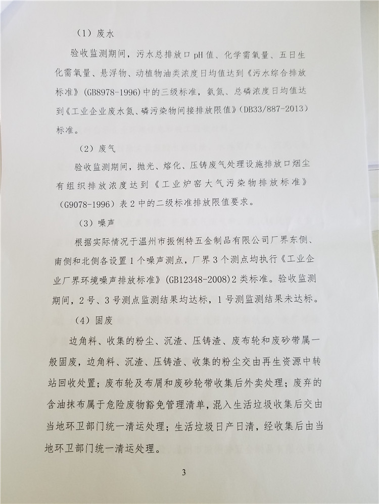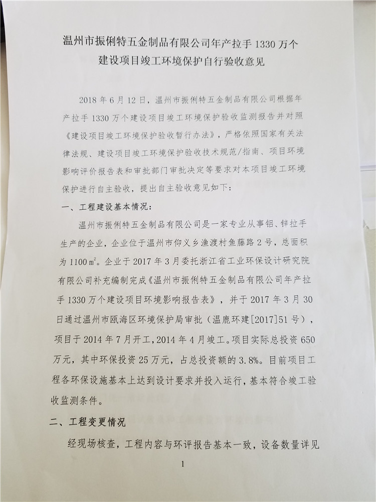 溫州市振俐特五金制品有限公司年產(chǎn)拉手1330萬個建設(shè)項目竣工環(huán)境保護自行驗收— —公示