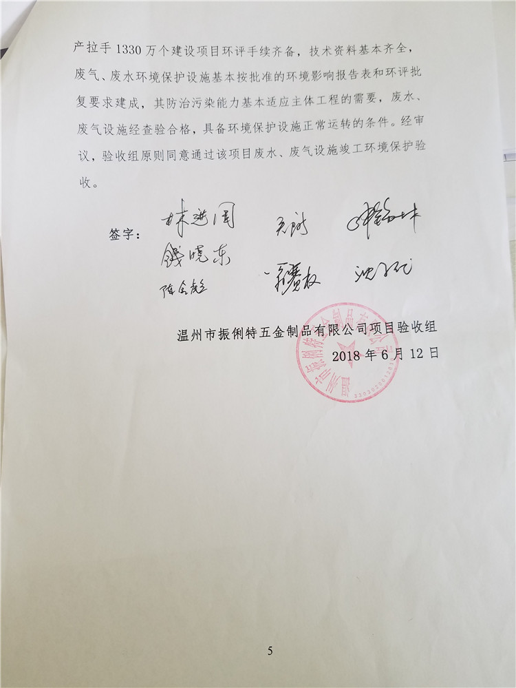 經(jīng)資料查閱和現(xiàn)場查驗,溫州市振俐特五金制品有限公司年產(chǎn)拉手1330萬個建設(shè)項目環(huán)評手續(xù)齊備,技術(shù)資料基本齊全,廢氣、廢水環(huán)境保護設(shè)施基本按批準的環(huán)境影響報告表和環(huán)評批復要求建成,其防治污染能力基本適應主體工程的需要,廢水、廢氣設(shè)施經(jīng)查驗合格,具備環(huán)境保護設(shè)施正常運轉(zhuǎn)的條件。經(jīng)審議,驗收組原則同意通過該項目廢水、廢氣設(shè)施竣工環(huán)境保護驗收。