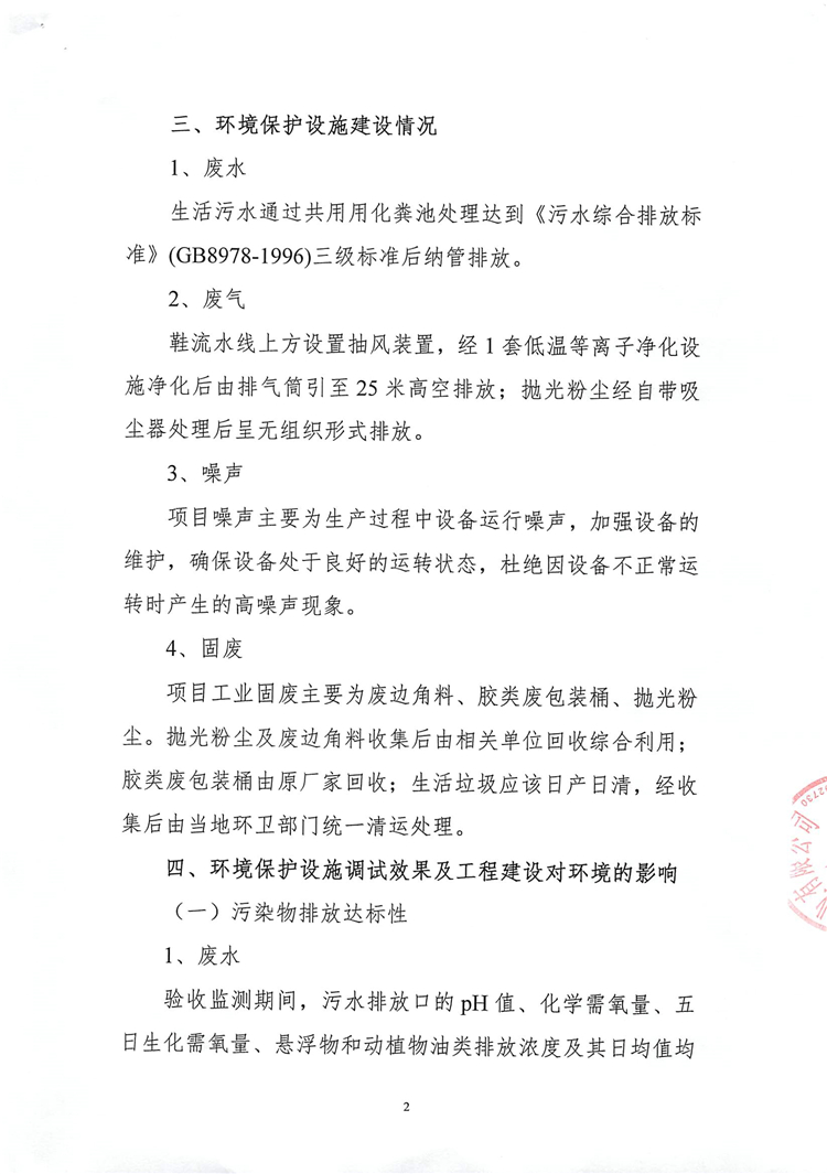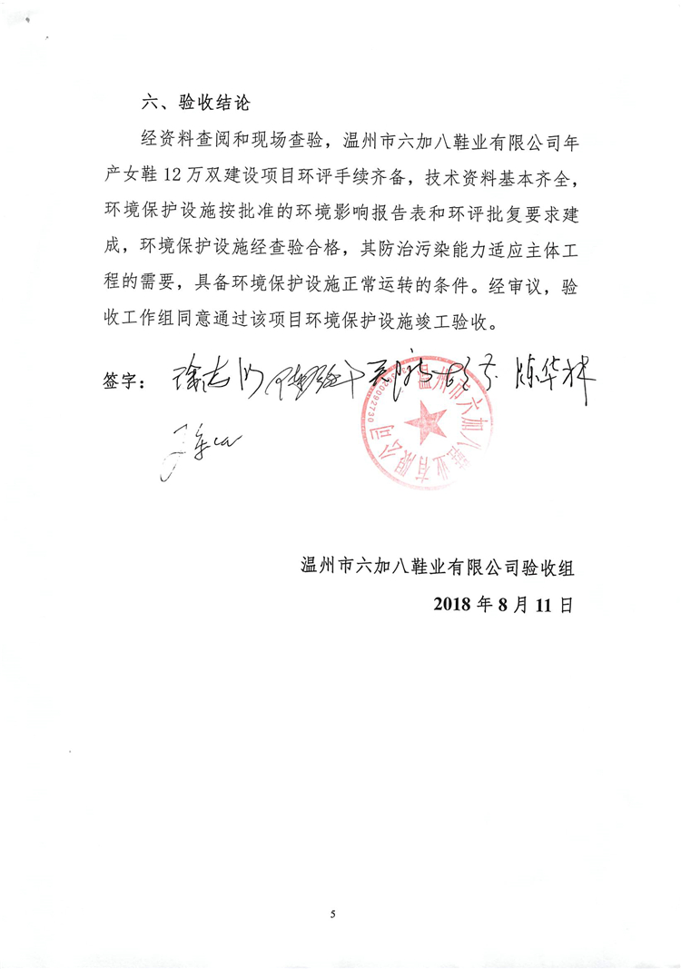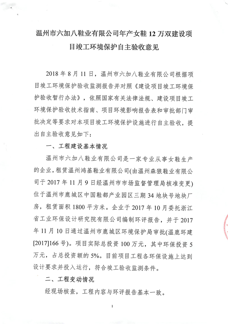 2018年8月11日,溫州市六加八鞋業(yè)有限公司根據(jù)項(xiàng)目竣工環(huán)境保護(hù)驗(yàn)收監(jiān)測報(bào)告并對(duì)照《建設(shè)項(xiàng)目竣工環(huán)境保護(hù)驗(yàn)收暫行辦法》,依照國家有關(guān)法律法規(guī)、建設(shè)項(xiàng)目竣工環(huán)境保護(hù)驗(yàn)收技術(shù)指南、項(xiàng)目環(huán)境影響報(bào)告表和審批部門審批決定等要求對(duì)本項(xiàng)目竣工環(huán)境保護(hù)設(shè)施進(jìn)行自主驗(yàn)收,提出自主驗(yàn)收意見如下: