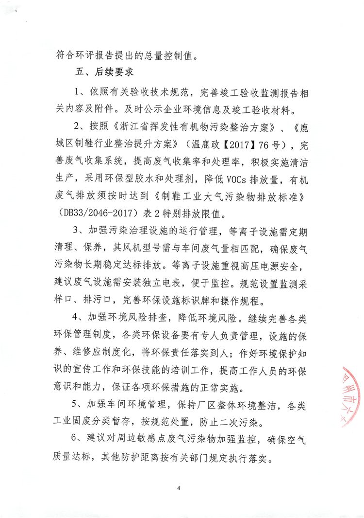 2、按照《浙江省揮發(fā)性有機(jī)物污染整治方案》、《鹿城區(qū)制鞋行業(yè)整治提升方案》(溫鹿政【2017】76號(hào)),完善廢氣收集系統(tǒng),提高廢氣收集率和處理率,積極實(shí)施清潔生產(chǎn),采用環(huán)保型膠水和處理劑,降低VOCs排放量,有機(jī)廢氣排放須按時(shí)達(dá)到《制鞋工業(yè)大氣污染物排放標(biāo)準(zhǔn)》(DB33/2046-2017)表2特別排放限值。
