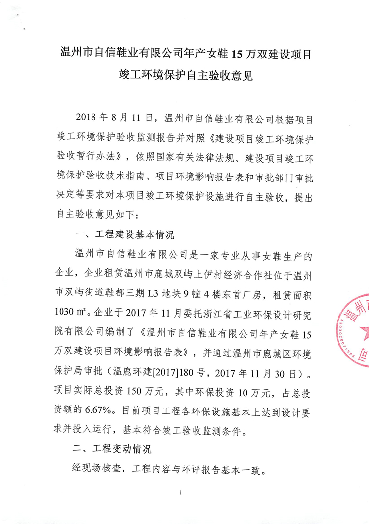 2018年8月11日,溫州市自信鞋業(yè)有限公司根據(jù)項(xiàng)目竣工環(huán)境保護(hù)驗(yàn)收監(jiān)測(cè)報(bào)告并對(duì)照《建設(shè)項(xiàng)目竣工環(huán)境保護(hù)驗(yàn)收暫行辦法》,依照國(guó)家有關(guān)法律法規(guī)、建設(shè)項(xiàng)目竣工環(huán)境保護(hù)驗(yàn)收技術(shù)指南、項(xiàng)目環(huán)境影響報(bào)告表和審批部門審批決定等要求對(duì)本項(xiàng)目竣工環(huán)境保護(hù)設(shè)施進(jìn)行自主驗(yàn)收,提出自主驗(yàn)收意見如下: