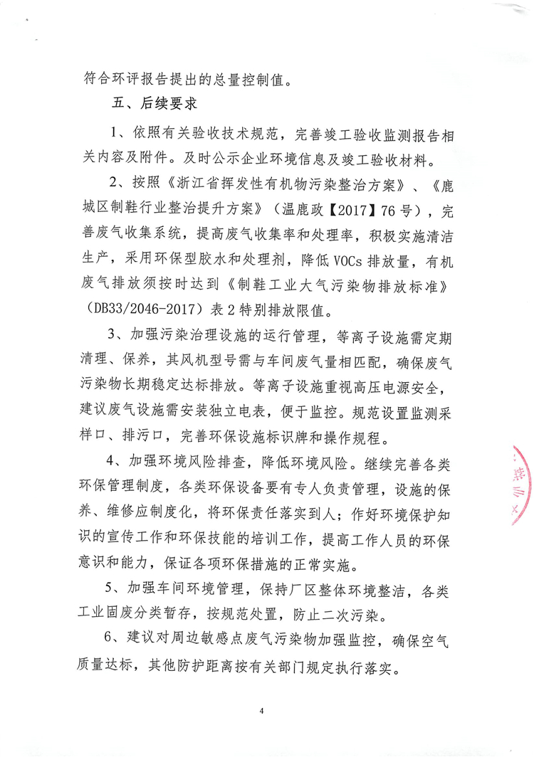 2、按照《浙江省揮發(fā)性有機(jī)物污染整治方案》、《鹿城區(qū)制鞋行業(yè)整治提升方案》(溫鹿政【2017】76號(hào)),完善廢氣收集系統(tǒng),提高廢氣收集率和處理率,積極實(shí)施清潔生產(chǎn),采用環(huán)保型膠水和處理劑,降低VOCs排放量,有機(jī)廢氣排放須按時(shí)達(dá)到《制鞋工業(yè)大氣污染物排放標(biāo)準(zhǔn)》(DB33/2046-2017)表2特別排放限值。