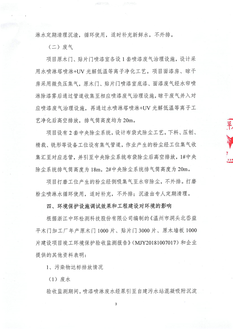 根據(jù)浙江中環(huán)檢測(cè)科技股份有限公司編制的《溫州市洞頭北岙益平木門加工廠年產(chǎn)原木門1000片、貼片門3000片、原木墻板1000片建設(shè)項(xiàng)目竣工環(huán)境保護(hù)驗(yàn)收監(jiān)測(cè)報(bào)告》(MJY20181007017)和企業(yè)提供的其他資料表明: