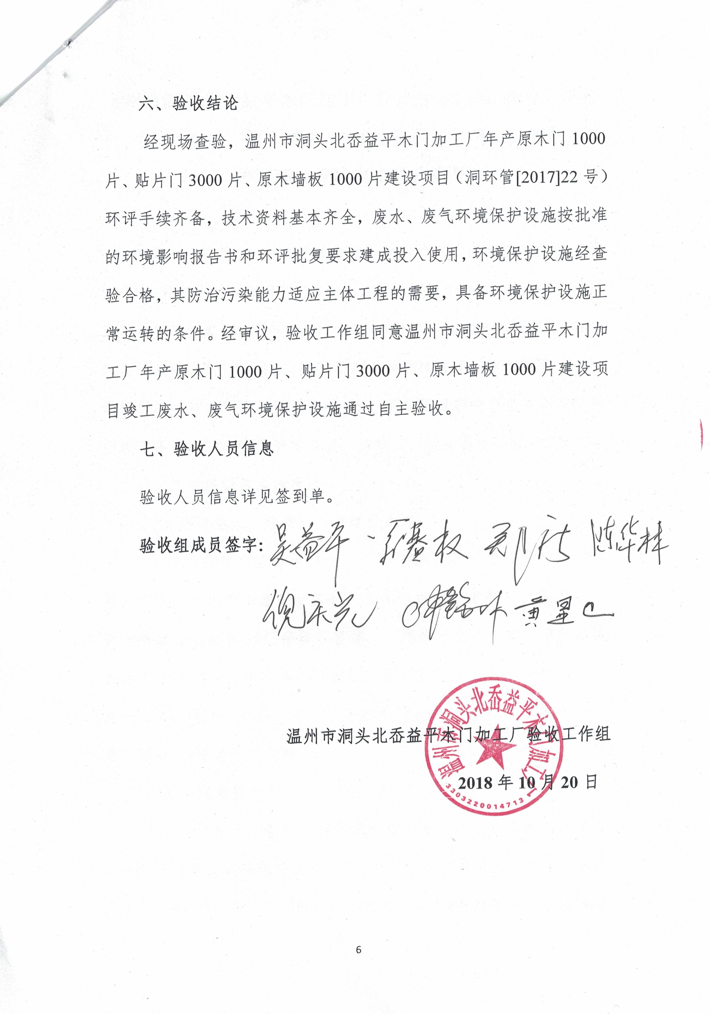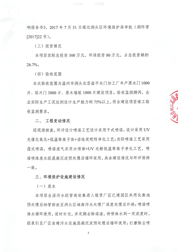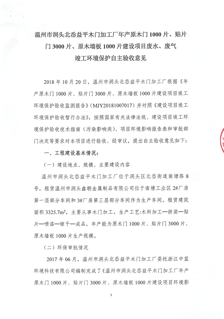 2018年10月20日,溫州市洞頭北岙益平木門加工廠根據(jù)《年產(chǎn)原木門1000片、貼片門3000片、原木墻板1000片建設(shè)項(xiàng)目竣工環(huán)境保護(hù)驗(yàn)收監(jiān)測(cè)報(bào)告》(MJY20181007017)并對(duì)照《建設(shè)項(xiàng)目竣工環(huán)境保護(hù)驗(yàn)收暫行辦法》,按照國(guó)家有關(guān)法律法規(guī)、建設(shè)項(xiàng)目竣工環(huán)境保護(hù)驗(yàn)收技術(shù)指南(污染影響類)、項(xiàng)目環(huán)境影響報(bào)告表和審批部門決定等要求對(duì)本項(xiàng)目進(jìn)行驗(yàn)收、經(jīng)審議,提出自主驗(yàn)收意見如下:
