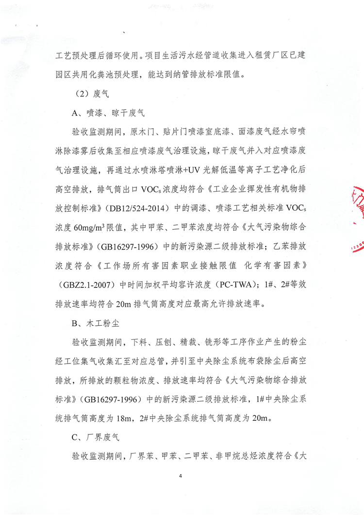 驗(yàn)收監(jiān)測(cè)期間,原木門、貼片門噴漆室底漆、面漆廢氣經(jīng)水簾噴淋除漆霧后收集至相應(yīng)噴漆廢氣治理設(shè)施,晾干廢氣并入對(duì)應(yīng)噴漆廢氣治理設(shè)施,再通過水噴淋塔噴淋+UV光解低溫等離子工藝凈化后高空排放,排氣筒出口VOCs濃度均符合《工業(yè)企業(yè)揮發(fā)性有機(jī)物排放控制標(biāo)準(zhǔn)》(DB12/524-2014)中的調(diào)漆、噴漆工藝相關(guān)標(biāo)準(zhǔn)VOCs濃度60mg/m3限值,其中甲苯、二甲苯濃度均符合《大氣污染物綜合排放標(biāo)準(zhǔn)》(GB16297-1996)中的新污染源二級(jí)排放標(biāo)準(zhǔn);乙苯排放濃度符合《工作場(chǎng)所有害因素職業(yè)接觸限值 化學(xué)有害因素》(GBZ2.1-2007)中時(shí)間加權(quán)平均容許濃度(PC-TWA);1#、2#等效排放速率均符合20m排氣筒高度對(duì)應(yīng)最高允許排放速率。