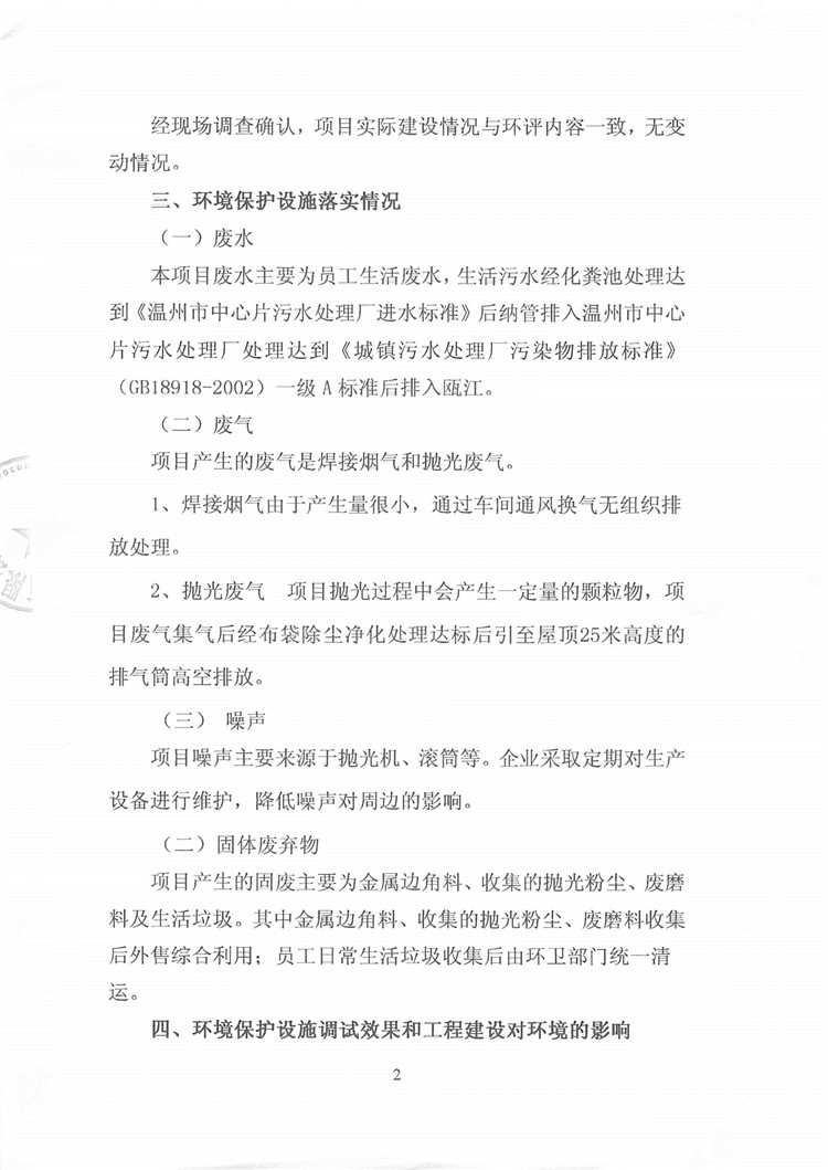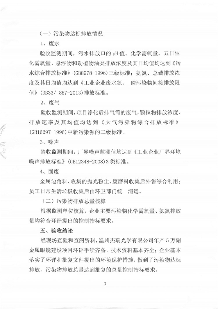 經(jīng)現(xiàn)場查驗(yàn)和查閱資料,溫州杰瑞光學(xué)有限公司年產(chǎn)5萬副金屬眼鏡建設(shè)項(xiàng)目環(huán)評(píng)手續(xù)齊備,技術(shù)資料基本齊全;企業(yè)基本落實(shí)了環(huán)評(píng)和批復(fù)文件提出的環(huán)境保護(hù)措施,做到了污染物達(dá)標(biāo)排放,污染物排放總量達(dá)到批復(fù)的總量控制指標(biāo)要求。