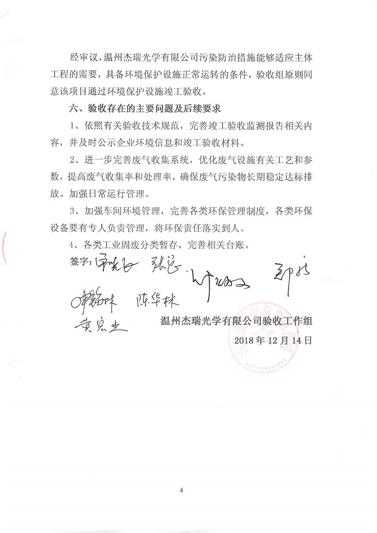 經(jīng)審議,溫州杰瑞光學(xué)有限公司污染防治措施能夠適應(yīng)主體工程的需要,具備環(huán)境保護(hù)設(shè)施正常運(yùn)轉(zhuǎn)的條件,驗(yàn)收組原則同意該項(xiàng)目通過環(huán)境保護(hù)設(shè)施竣工驗(yàn)收。