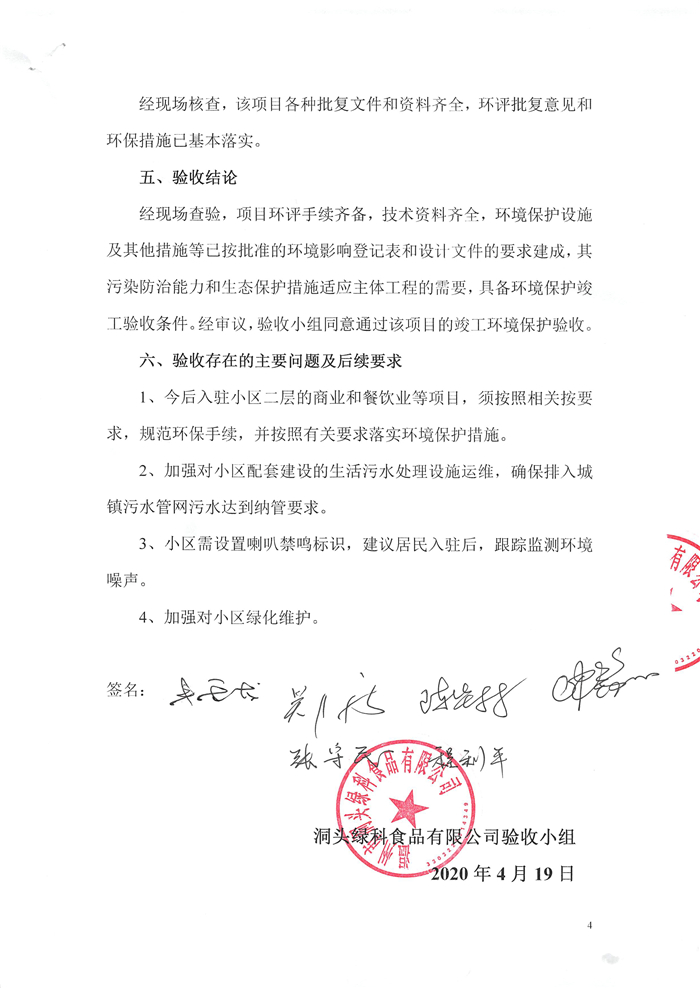 2020年4月6日,洞頭綠科食品有限公司組織召開洞頭綠科公寓新建項(xiàng)目竣工環(huán)境保護(hù)自行驗(yàn)收會議。自行驗(yàn)收小組由建設(shè)單位(洞頭綠科食品有限公司)、驗(yàn)收調(diào)查單位(溫州市甌海環(huán)保設(shè)計(jì)研究所)、設(shè)計(jì)單位(浙江新中環(huán)建筑設(shè)計(jì)有限公司)、施工單位(溫州市騰圣建設(shè)有限公司)和特邀3名專家組成,后附驗(yàn)收小組成員名單。驗(yàn)收組查閱有關(guān)材料,進(jìn)行了現(xiàn)場核查,聽取有關(guān)單位的相關(guān)匯報(bào),并依據(jù)有關(guān)法律法規(guī)、技術(shù)規(guī)范、環(huán)評報(bào)告及批復(fù)意見,經(jīng)認(rèn)真研究討論形成如下驗(yàn)收意見:
